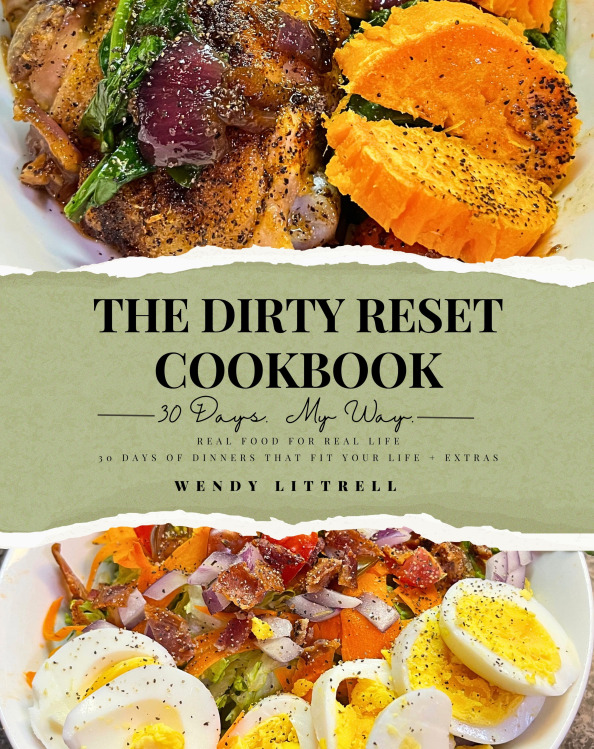 The Dirty Reset™ is 30 days of real food, cooked at home, with zero pressure to be perfect. No restarts. No weird rules. Just figuring out what works and sharing it from my kitchen table, snack in hand,